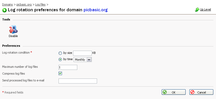 A few of our websites receive high traffic and, as a result, the apache log files grow very large, very quickly. By default, Plesk rotates logs every 2,025,139 KB (2GB). This is way too large for a virtualised server such as ours, which provides 10GB of precious disk space.